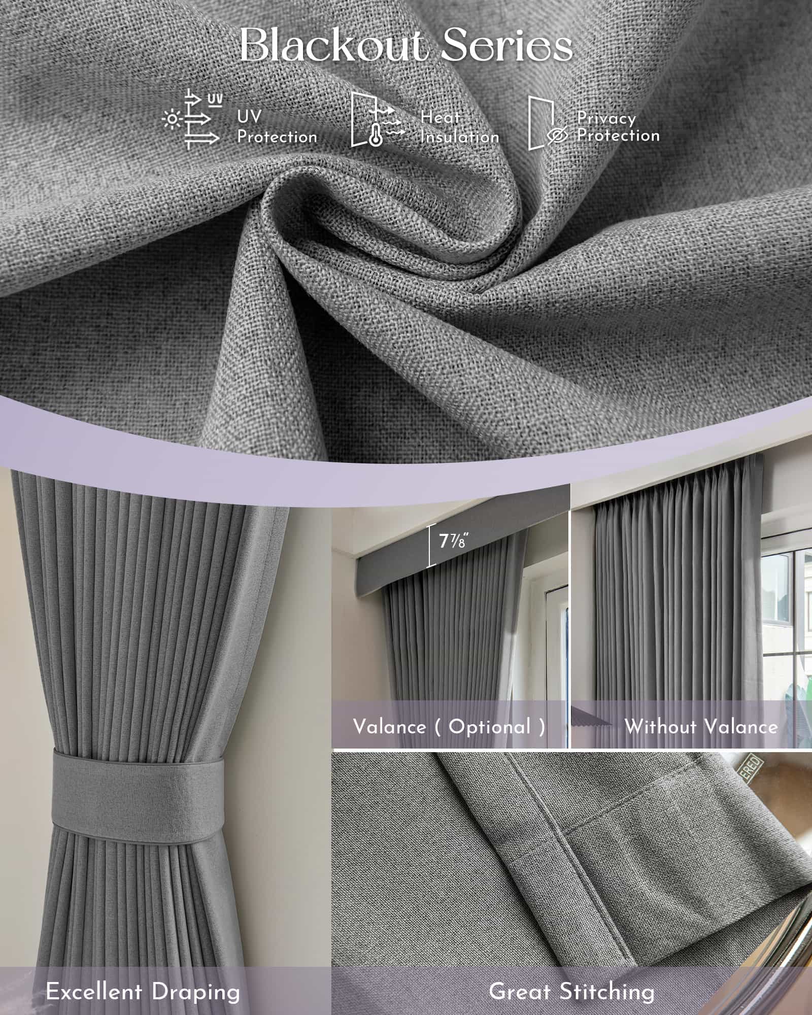 Light filtering satin fabric of curtain.